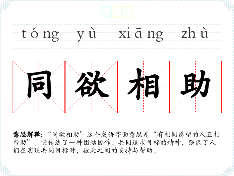 “同欲相助”这个成语字面意思是“有相同愿望的人互相帮助”。它传达了一种团结协作、共同追求目标的精神,强调了人们在实现共同目标时,彼此之间的支持与帮助。