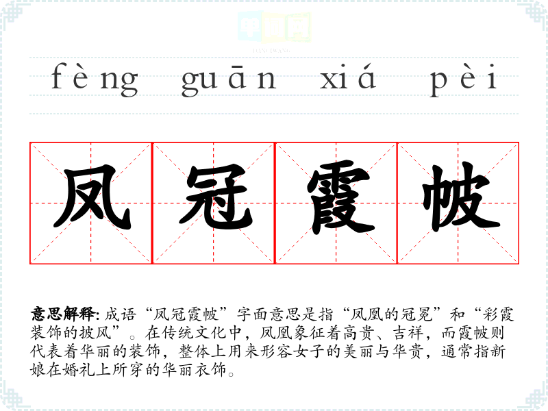 成语“凤冠霞帔”字面意思是指“凤凰的冠冕”和“彩霞装饰的披风”。在传统文化中,凤凰象征着高贵、吉祥,而霞帔则代表着华丽的装饰,整体上用来形容女子的美丽与华贵,通常指新娘在婚礼上所穿的华丽衣饰。