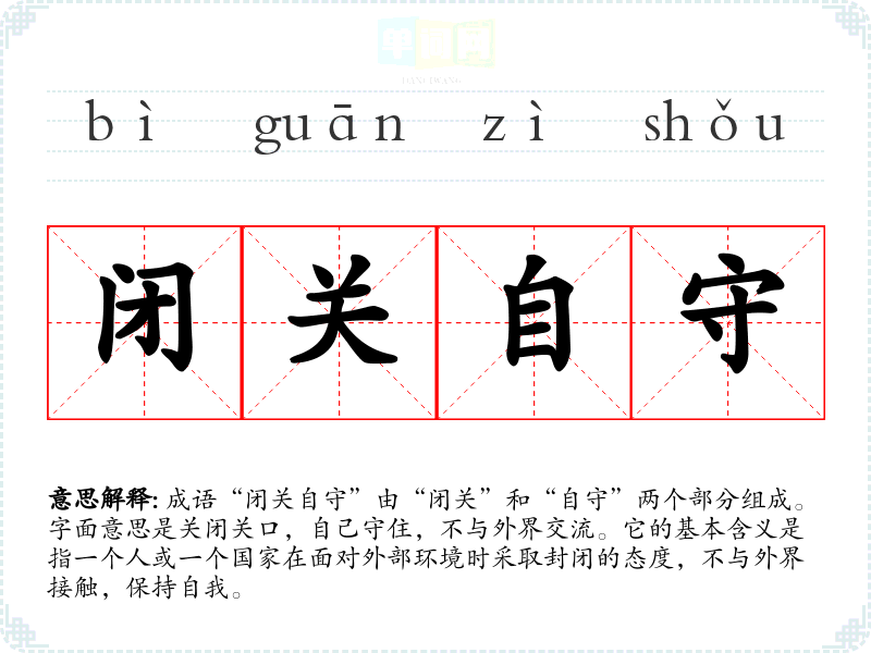 成语“闭关自守”由“闭关”和“自守”两个部分组成。字面意思是关闭关口,自己守住,不与外界交流。它的基本含义是指一个人或一个国家在面对外部环境时采取封闭的态度,不与外界接触,保持自我。