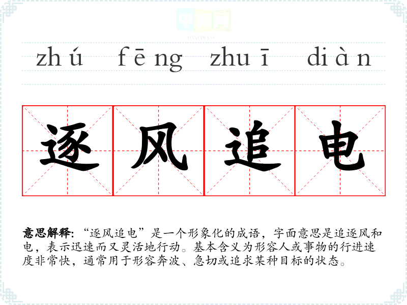 在现代社会,尤其是在快节奏的生活和工作环境中,“逐风追电”体现了人们对效率和速度的追求。它反映了当今社会中竞争激烈的特征,人们常常需要在短时间内做出反应和决策。
