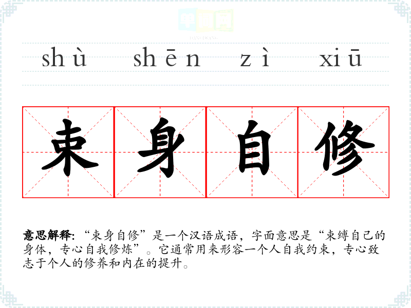 | 束身自修 | 指约束自己,不与坏人坏事同流合污。 |
