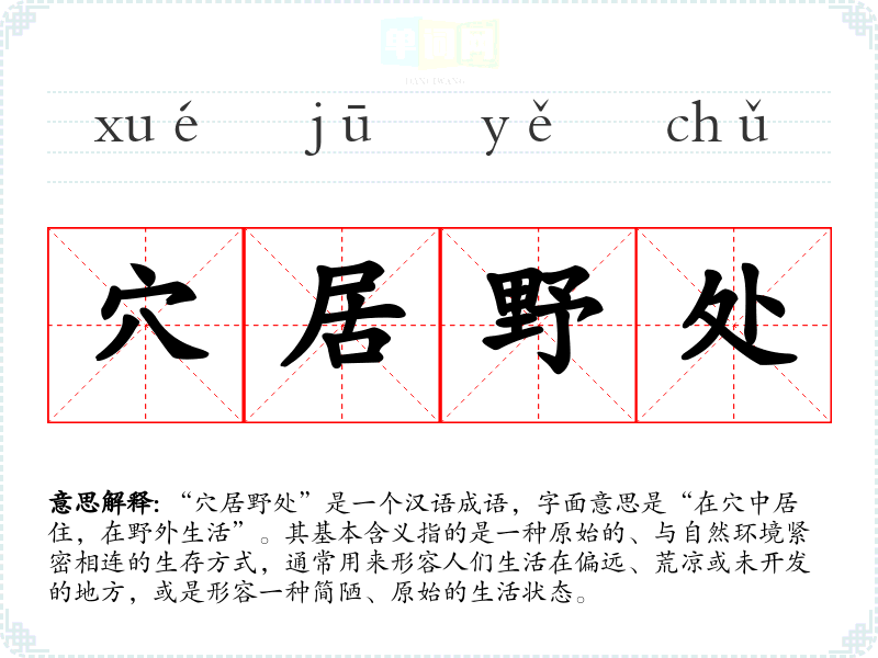 | 穴居野处 | 穴:洞;处:居住。居住在洞里生活在荒野。形容原始人的生活状况。 |