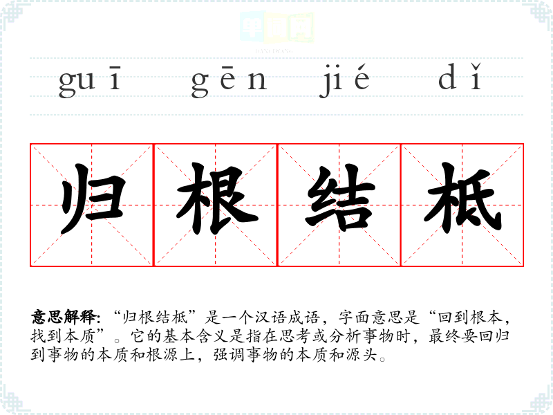 “归根结柢”是一个汉语成语,字面意思是“回到根本,找到本质”。它的基本含义是指在思考或分析事物时,最终要回归到事物的本质和根源上,强调事物的本质和源头。