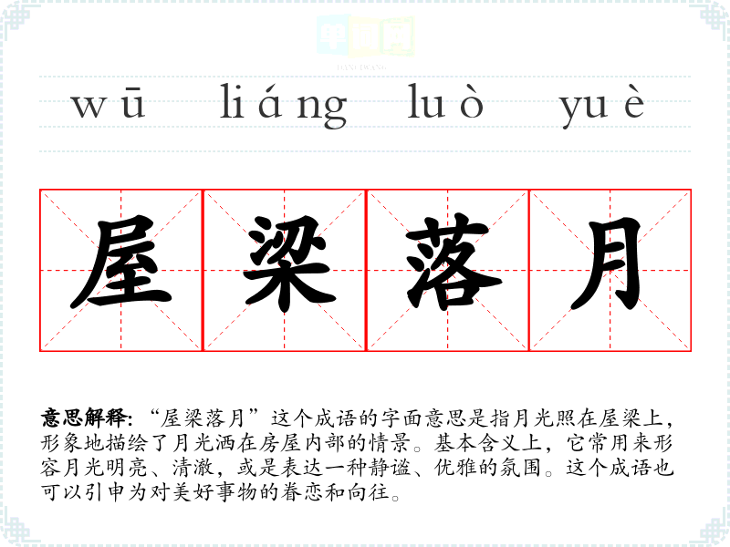 “屋梁落月”这个成语的字面意思是指月光照在屋梁上,形象地描绘了月光洒在房屋内部的情景。基本含义上,它常用来形容月光明亮、清澈,或是表达一种静谧、优雅的氛围。这个成语也可以引申为对美好事物的眷恋和向往。