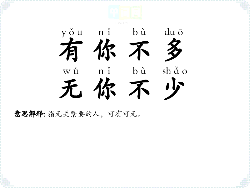| 有一搭没一搭 | 表示故意找话说。也表示可有可无,无足轻重。 |