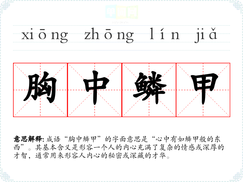 成语“胸中鳞甲”的字面意思是“心中有如鳞甲般的东西”。其基本含义是形容一个人的内心充满了复杂的情感或深厚的才智,通常用来形容人内心的秘密或深藏的才华。