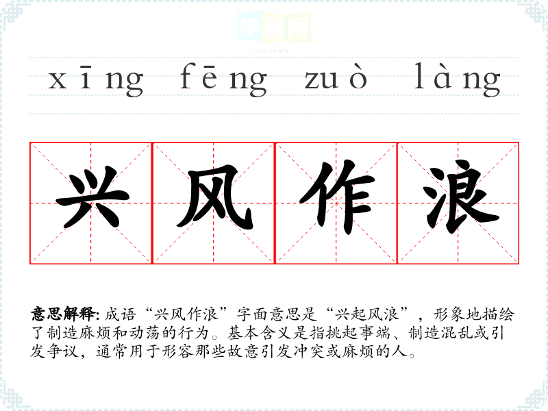 成语“兴风作浪”字面意思是“兴起风浪”,形象地描绘了制造麻烦和动荡的行为。基本含义是指挑起事端、制造混乱或引发争议,通常用于形容那些故意引发冲突或麻烦的人。