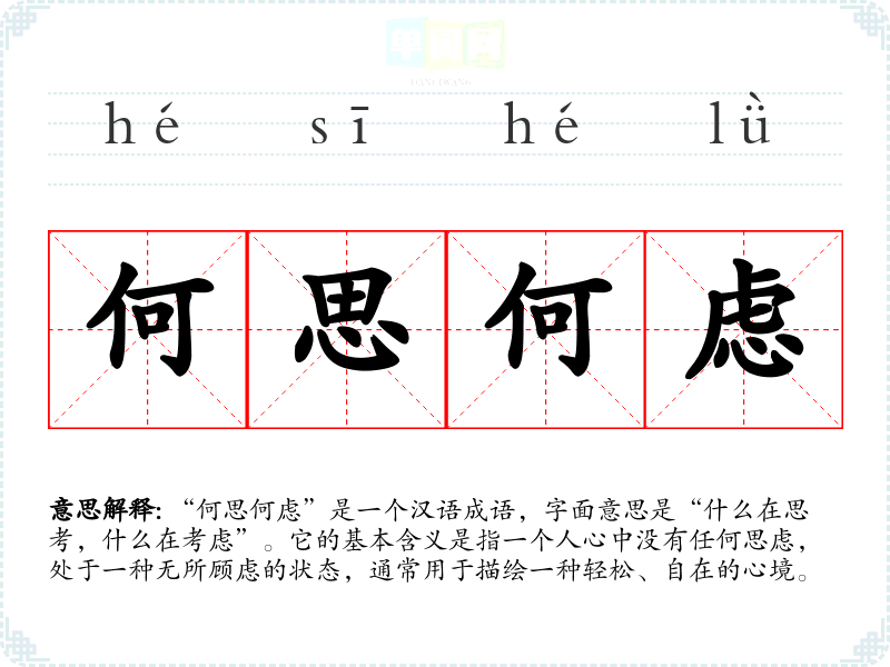 “何思何虑”是一个汉语成语,字面意思是“什么在思考,什么在考虑”。它的基本含义是指一个人心中没有任何思虑,处于一种无所顾虑的状态,通常用于描绘一种轻松、自在的心境。