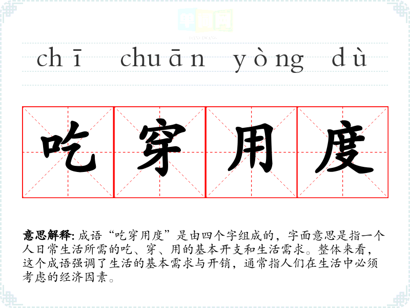 成语“吃穿用度”是由四个字组成的,字面意思是指一个人日常生活所需的吃、穿、用的基本开支和生活需求。整体来看,这个成语强调了生活的基本需求与开销,通常指人们在生活中必须考虑的经济因素。