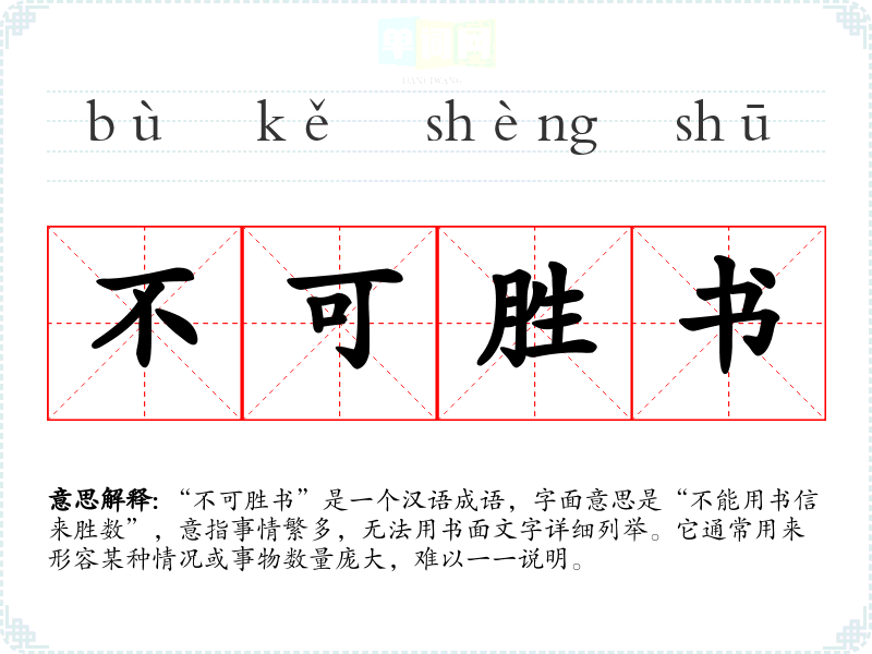 “不可胜书”是一个汉语成语,字面意思是“不能用书信来胜数”,意指事情繁多,无法用书面文字详细列举。它通常用来形容某种情况或事物数量庞大,难以一一说明。