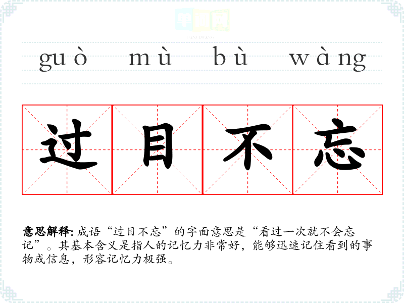 成语“过目不忘”的字面意思是“看过一次就不会忘记”。其基本含义是指人的记忆力非常好,能够迅速记住看到的事物或信息,形容记忆力极强。