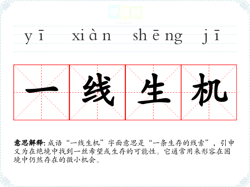 成语“一线生机”字面意思是“一条生存的线索”,引申义为在绝境中找到一丝希望或生存的可能性。它通常用来形容在困境中仍然存在的微小机会。