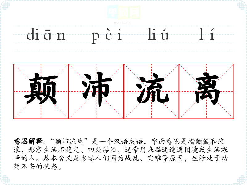 “颠沛流离”是一个汉语成语,字面意思是指颠簸和流浪,形容生活不稳定、四处漂泊,通常用来描述遭遇困境或生活艰辛的人。基本含义是形容人们因为战乱、灾难等原因,生活处于动荡不安的状态。