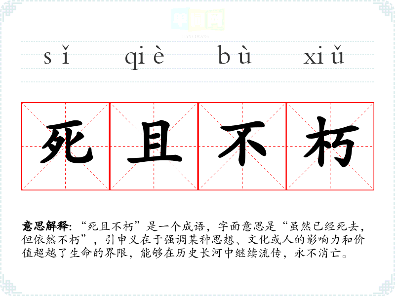 “死且不朽”是一个成语,字面意思是“虽然已经死去,但依然不朽”,引申义在于强调某种思想、文化或人的影响力和价值超越了生命的界限,能够在历史长河中继续流传,永不消亡。