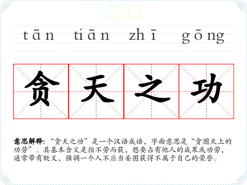 “贪天之功”是一个汉语成语,字面意思是“贪图天上的功劳”。其基本含义是指不劳而获,想要占有他人的成果或功劳,通常带有贬义,强调一个人不应当妄图获得不属于自己的荣誉。