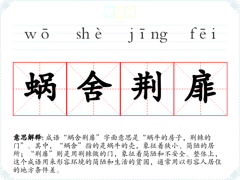 成语“蜗舍荆扉”字面意思是“蜗牛的房子,荆棘的门”。其中,“蜗舍”指的是蜗牛的壳,象征着狭小、简陋的居所;“荆扉”则是用荆棘做的门,象征着简陋和不安全。整体上,这个成语用来形容环境的简陋和生活的贫困,通常用以形容人居住的地方条件差。