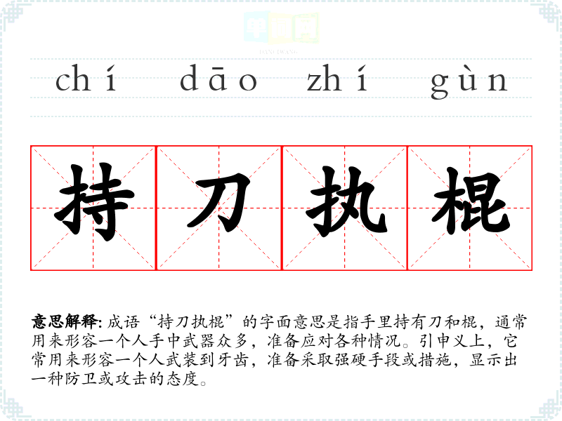 成语“持刀执棍”的字面意思是指手里持有刀和棍,通常用来形容一个人手中武器众多,准备应对各种情况。引申义上,它常用来形容一个人武装到牙齿,准备采取强硬手段或措施,显示出一种防卫或攻击的态度。