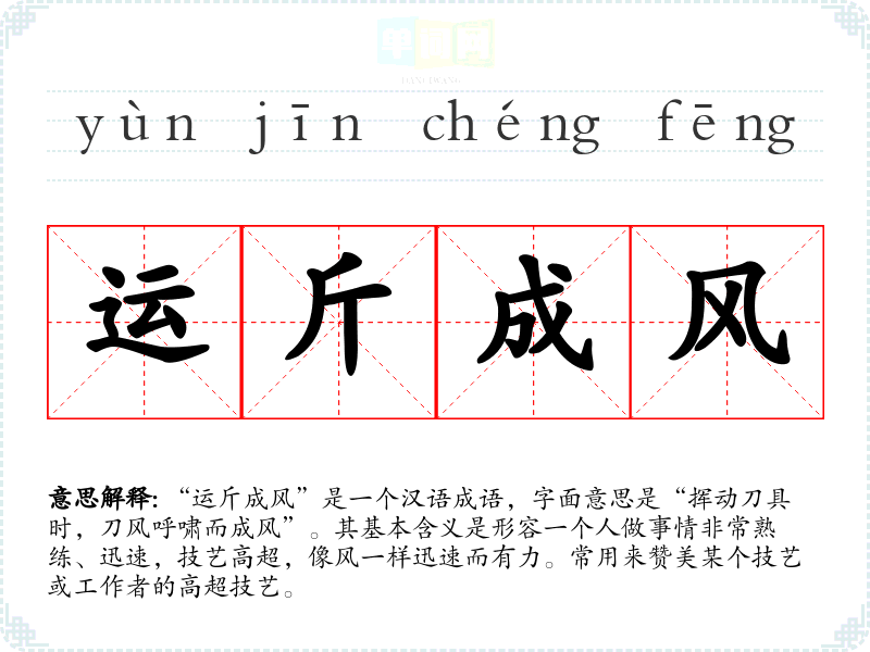 “运斤成风”是一个汉语成语,字面意思是“挥动刀具时,刀风呼啸而成风”。其基本含义是形容一个人做事情非常熟练、迅速,技艺高超,像风一样迅速而有力。常用来赞美某个技艺或工作者的高超技艺。
