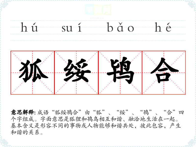 成语“狐绥鸨合”由“狐”、“绥”、“鸨”、“合”四个字组成。字面意思是狐狸和鸨鸟相互和谐、融洽地生活在一起。基本含义是形容不同的事物或人物能够和谐共处,彼此包容,产生和谐的关系。