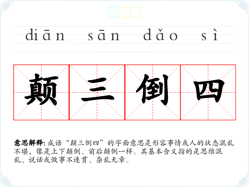 成语“颠三倒四”的字面意思是形容事情或人的状态混乱不堪,像是上下颠倒、前后颠倒一样。其基本含义指的是思维混乱、说话或做事不连贯、杂乱无章。