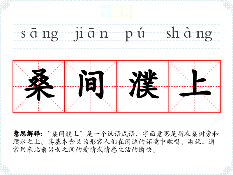“桑间濮上”是一个汉语成语,字面意思是指在桑树旁和濮水之上。其基本含义为形容人们在闲适的环境中歌唱、游玩,通常用来比喻男女之间的爱情或情感生活的愉快。