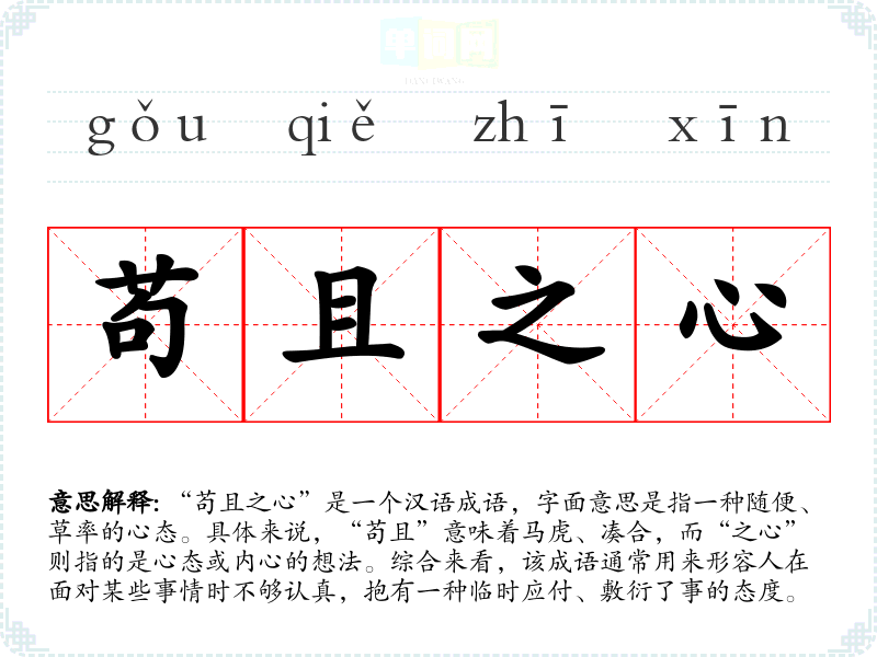 “苟且之心”这一成语的来源可以追溯到古代文献,尤其是《论语》中对人品和道德态度的讨论。虽然“苟且”一词在古文中多用于表达不严谨、不认真,但这一成语并没有明确的出处。它的用法逐渐演变成为对某种消极态度的批评,特别是在道德与责任感方面。