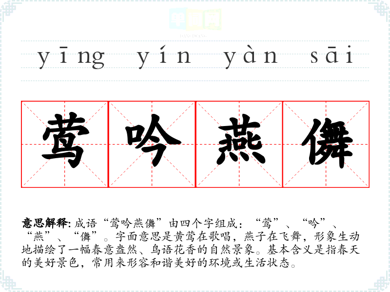 | 莺歌燕语 | 黄鹂歌唱,燕子呢喃。形容春天的美好景象。 |