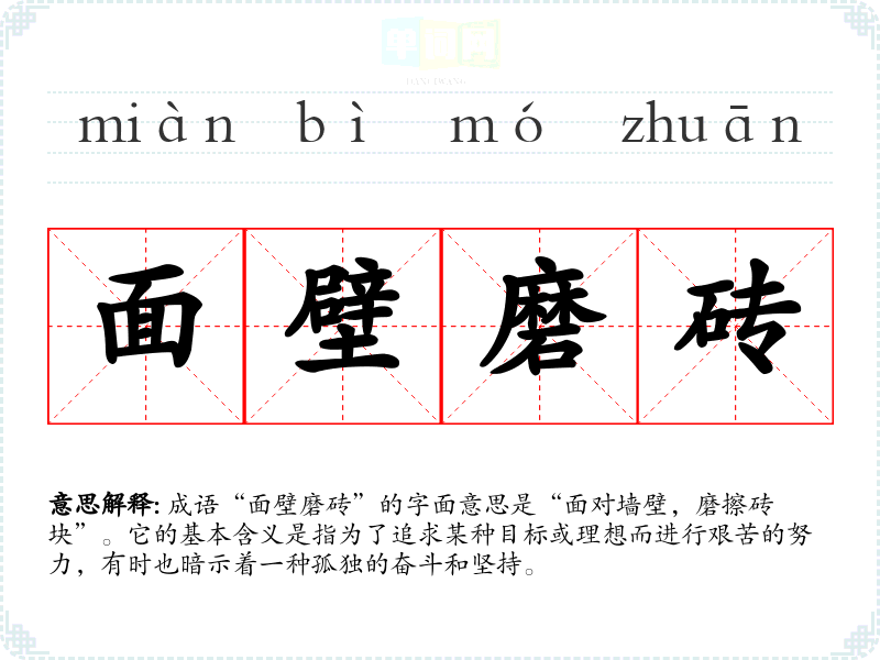 成语“面壁磨砖”的字面意思是“面对墙壁,磨擦砖块”。它的基本含义是指为了追求某种目标或理想而进行艰苦的努力,有时也暗示着一种孤独的奋斗和坚持。