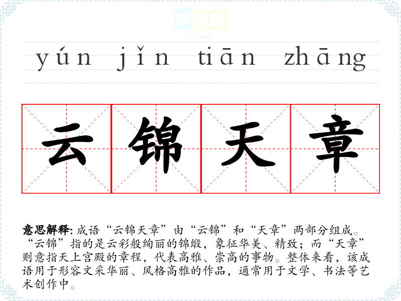 成语“云锦天章”由“云锦”和“天章”两部分组成。“云锦”指的是云彩般绚丽的锦缎,象征华美、精致;而“天章”则意指天上宫殿的章程,代表高雅、崇高的事物。整体来看,该成语用于形容文采华丽、风格高雅的作品,通常用于文学、书法等艺术创作中。