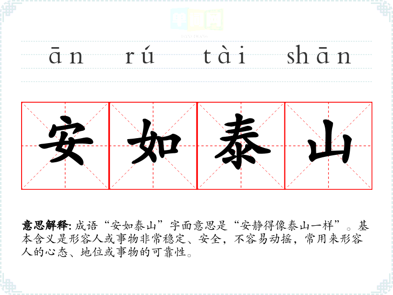 成语“安如泰山”字面意思是“安静得像泰山一样”。基本含义是形容人或事物非常稳定、安全,不容易动摇,常用来形容人的心态、地位或事物的可靠性。