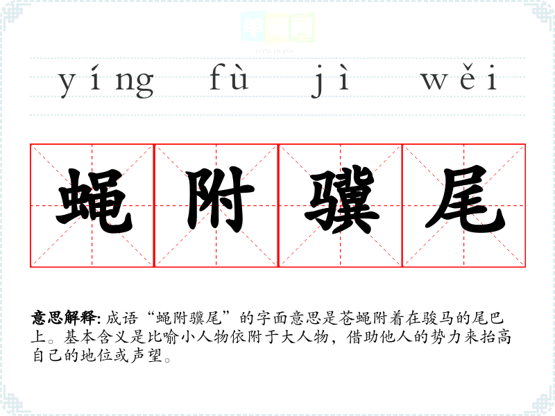 成语“蝇附骥尾”的字面意思是苍蝇附着在骏马的尾巴上。基本含义是比喻小人物依附于大人物,借助他人的势力来抬高自己的地位或声望。