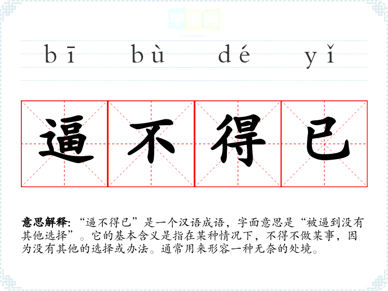 “逼不得已”是一个汉语成语,字面意思是“被逼到没有其他选择”。它的基本含义是指在某种情况下,不得不做某事,因为没有其他的选择或办法。通常用来形容一种无奈的处境。