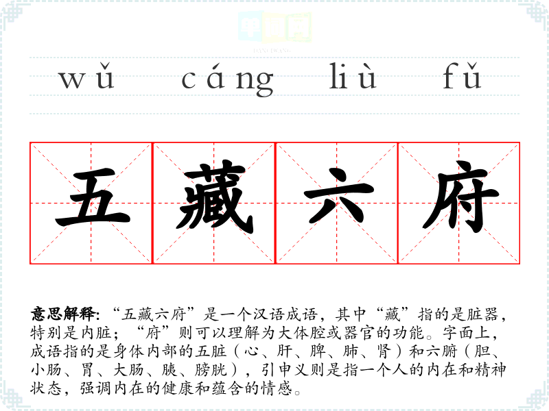 “五藏六府”是一个汉语成语,其中“藏”指的是脏器,特别是内脏;“府”则可以理解为大体腔或器官的功能。字面上,成语指的是身体内部的五脏(心、肝、脾、肺、肾)和六腑(胆、小肠、胃、大肠、胰、膀胱),引申义则是指一个人的内在和精神状态,强调内在的健康和蕴含的情感。