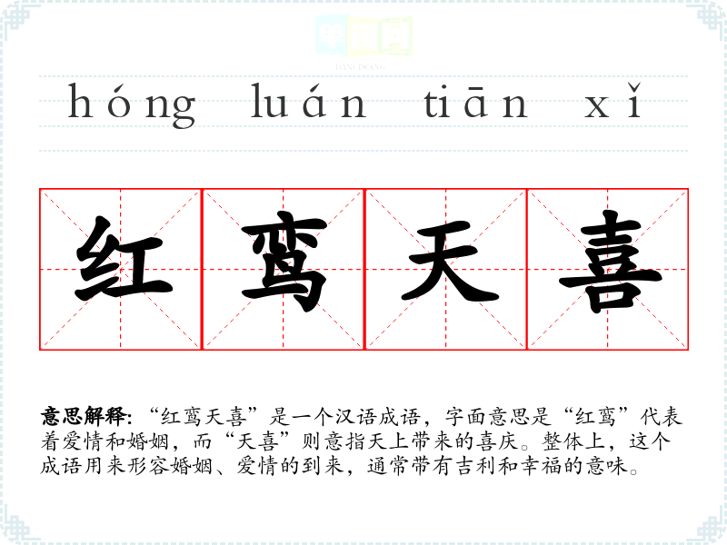 “红鸾天喜”是一个汉语成语,字面意思是“红鸾”代表着爱情和婚姻,而“天喜”则意指天上带来的喜庆。整体上,这个成语用来形容婚姻、爱情的到来,通常带有吉利和幸福的意味。