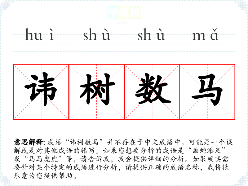 成语“讳树数马”并不存在于中文成语中。可能是一个误解或是对其他成语的错写。如果您想要分析的成语是“画蛇添足”或“马马虎虎”等,请告诉我,我会提供详细的分析。如果确实需要针对某个特定的成语进行分析,请提供正确的成语名称,我将很乐意为您提供帮助。