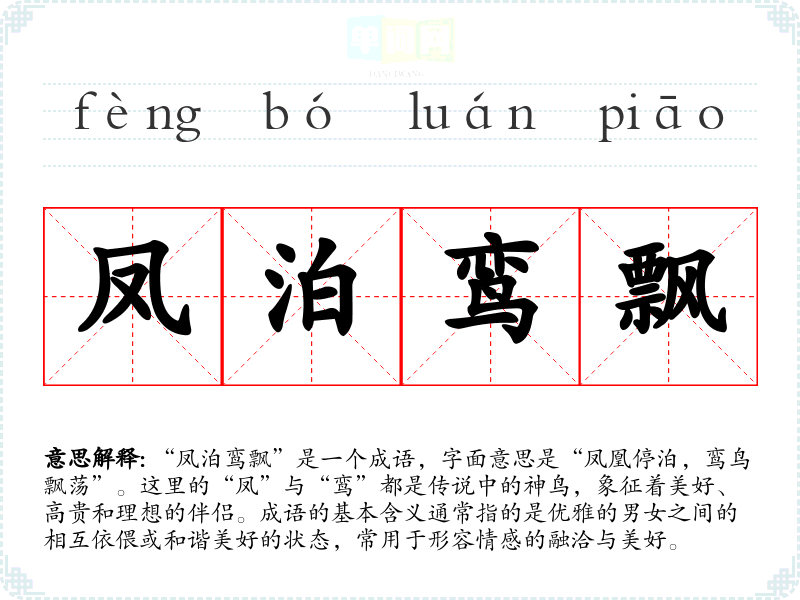“凤泊鸾飘”最早可以追溯到古代文学作品中,尤其是一些描述男女情感的诗歌和词曲。在古代,凤凰与鸾鸟常常被用来象征高贵的爱情与理想的伴侣关系。具体的出处可能并不明确,但其意象在**古代文化中广泛传播。
