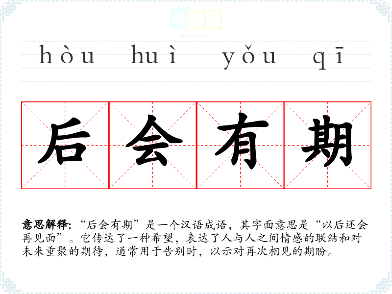 | 后会有期 | 期:时间。以后有见面的时候(用在分别时安慰对方)。 |