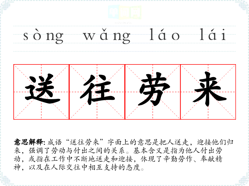 通过对“送往劳来”这个成语的学习,我认识到它不仅是对劳动的赞美,更是对人际关系的重要思考。在日常生活中,理解并应用这一精神,可以促进更和谐的人际关系和团队合作,帮助我在语言学习和表达上更加精准与深刻。
