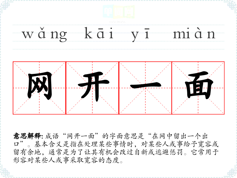 成语“网开一面”的字面意思是“在网中留出一个出口”。基本含义是指在处理某些事情时,对某些人或事给予宽容或留有余地,通常是为了让其有机会改过自新或逃避惩罚。它常用于形容对某些人或事采取宽容的态度。