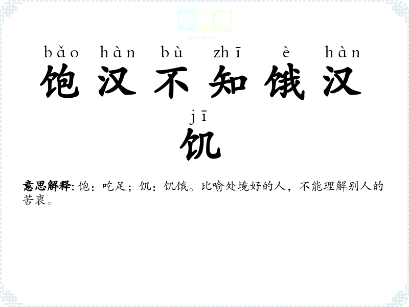 | 饱汉不知饿汉饥 | 饱:吃足;饥:饥饿。比喻处境好的人,不能理解别人的苦衷。 |