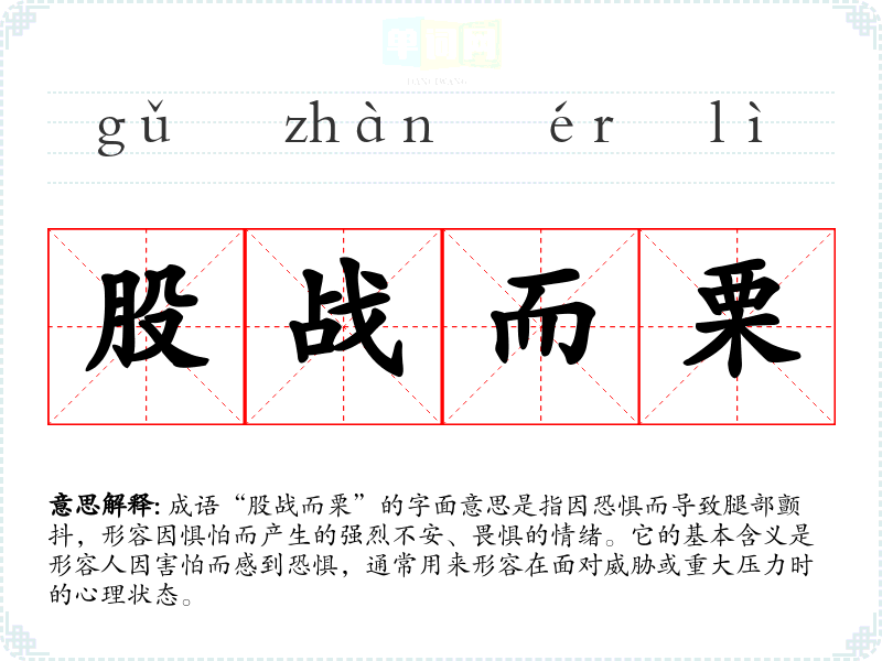 成语“股战而栗”的字面意思是指因恐惧而导致腿部颤抖,形容因惧怕而产生的强烈不安、畏惧的情绪。它的基本含义是形容人因害怕而感到恐惧,通常用来形容在面对威胁或重大压力时的心理状态。