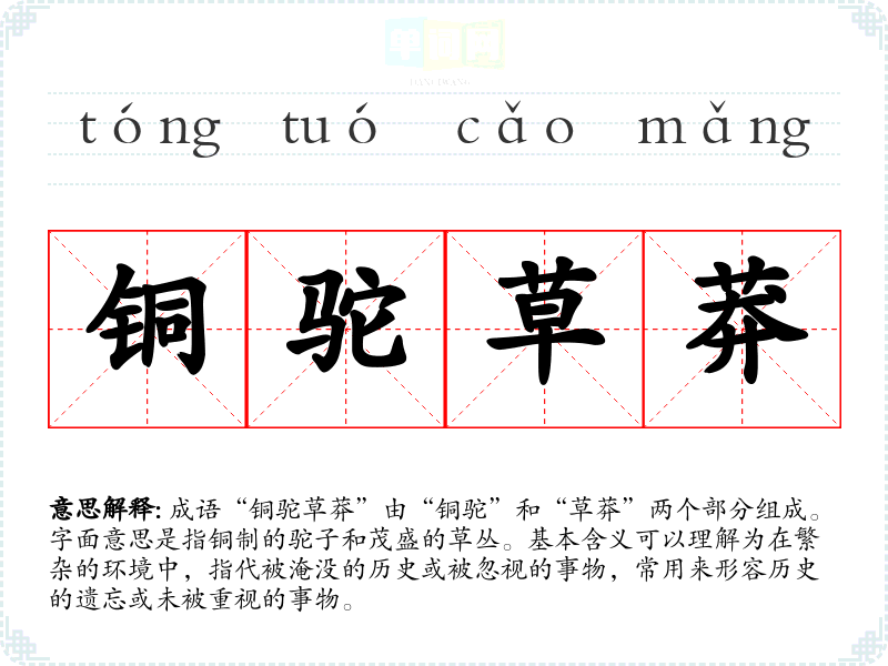 “铜驼草莽”源自《史记·大宰列传》,在这篇文章中提到,铜驼是古代一种用于标志的器物,而草莽则指的是野草丛生的地方。这个成语用于比喻那些在历史长河中被埋没的故事或人物,反映了人们对历史的忽视和对名士的遗忘。