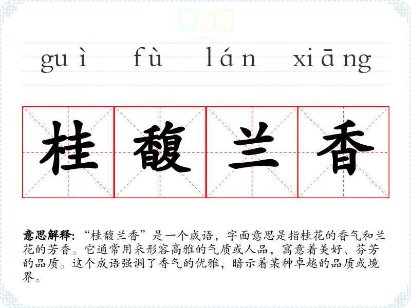“桂馥兰香”是一个成语,字面意思是指桂花的香气和兰花的芳香。它通常用来形容高雅的气质或人品,寓意着美好、芬芳的品质。这个成语强调了香气的优雅,暗示着某种卓越的品质或境界。