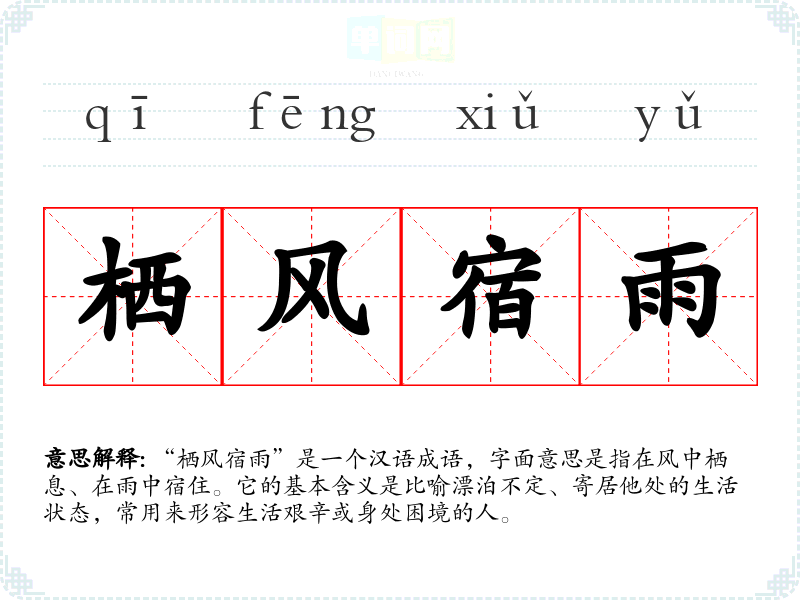 “栖风宿雨”是一个汉语成语,字面意思是指在风中栖息、在雨中宿住。它的基本含义是比喻漂泊不定、寄居他处的生活状态,常用来形容生活艰辛或身处困境的人。
