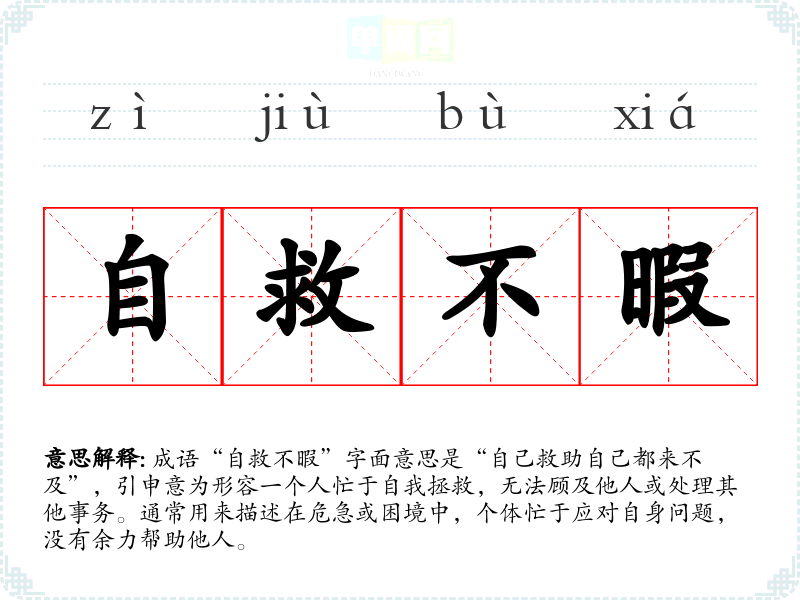 成语“自救不暇”字面意思是“自己救助自己都来不及”,引申意为形容一个人忙于自我拯救,无法顾及他人或处理其他事务。通常用来描述在危急或困境中,个体忙于应对自身问题,没有余力帮助他人。