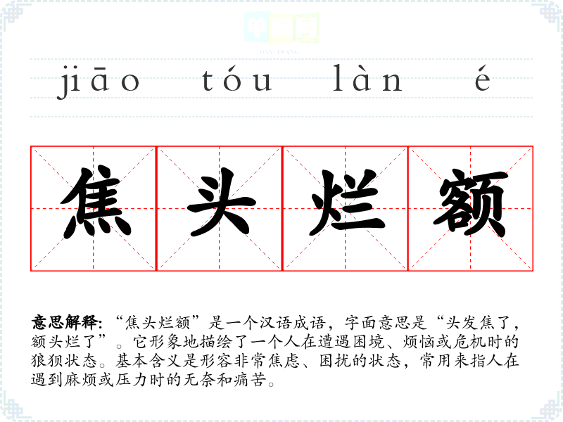 - 日常对话:朋友间谈论工作压力、生活烦恼时可以说“我最近真是焦头烂额”。