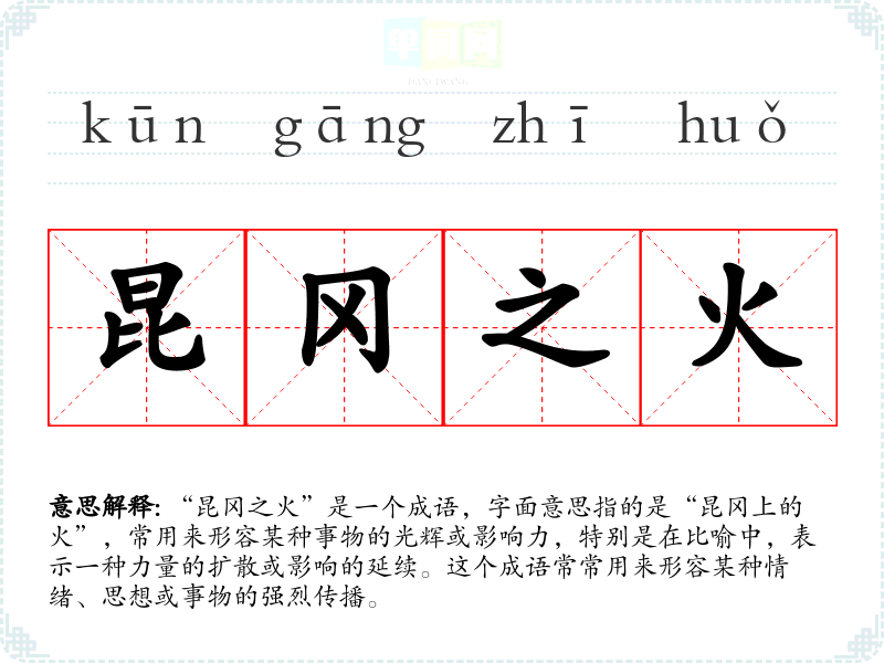 “昆冈之火”是一个成语,字面意思指的是“昆冈上的火”,常用来形容某种事物的光辉或影响力,特别是在比喻中,表示一种力量的扩散或影响的延续。这个成语常常用来形容某种情绪、思想或事物的强烈传播。