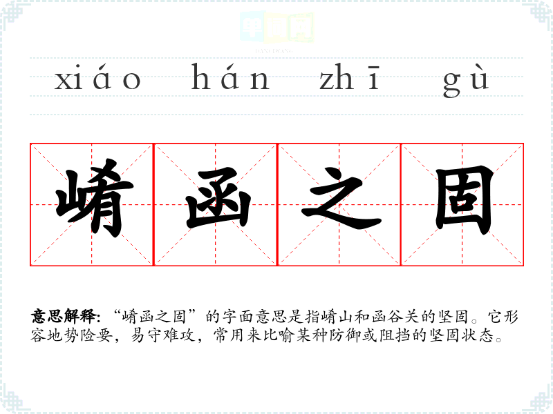 “崤函之固”的字面意思是指崤山和函谷关的坚固。它形容地势险要,易守难攻,常用来比喻某种防御或阻挡的坚固状态。