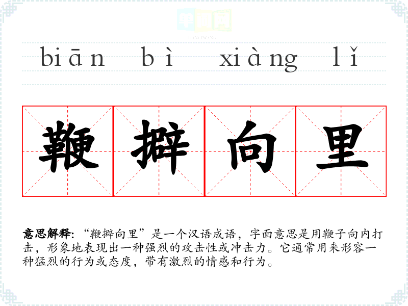 通过对“鞭擗向里”的学,我认识到这个成语不仅是语言的艺术,也是激励自我、面对挑战的重要精神力量。在语言学和表达中,理解这样的成语可以丰富我们的表达方式,使交流更为生动、有力。