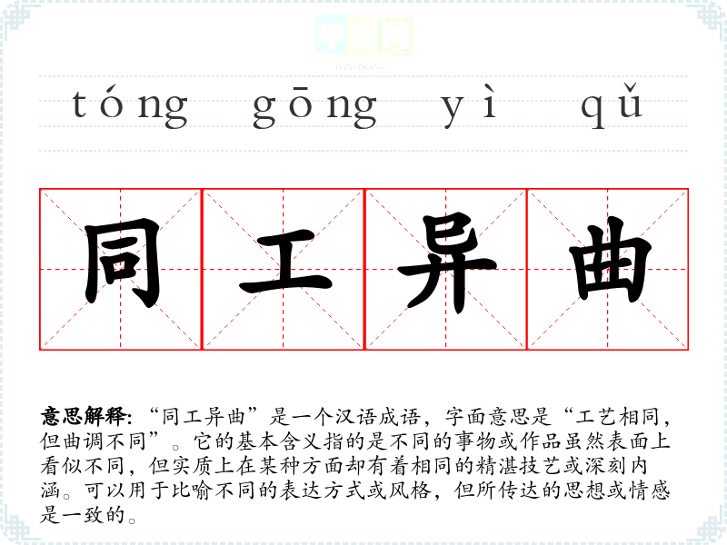 “同工异曲”是一个汉语成语,字面意思是“工艺相同,但曲调不同”。它的基本含义指的是不同的事物或作品虽然表面上看似不同,但实质上在某种方面却有着相同的精湛技艺或深刻内涵。可以用于比喻不同的表达方式或风格,但所传达的思想或情感是一致的。